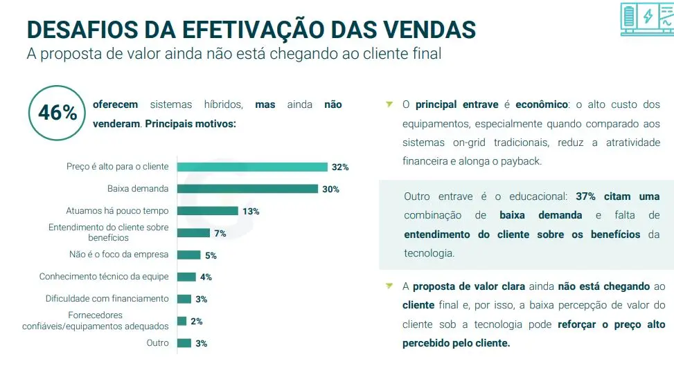 A Greener identificou isso questionando os integradores sobre as principais dificuldades sentidas por eles para fechar negócios. Segundo a pesquisa, quase um terço (32%) das empresas indicou o alto custo dos equipamentos como um grande gargalo.