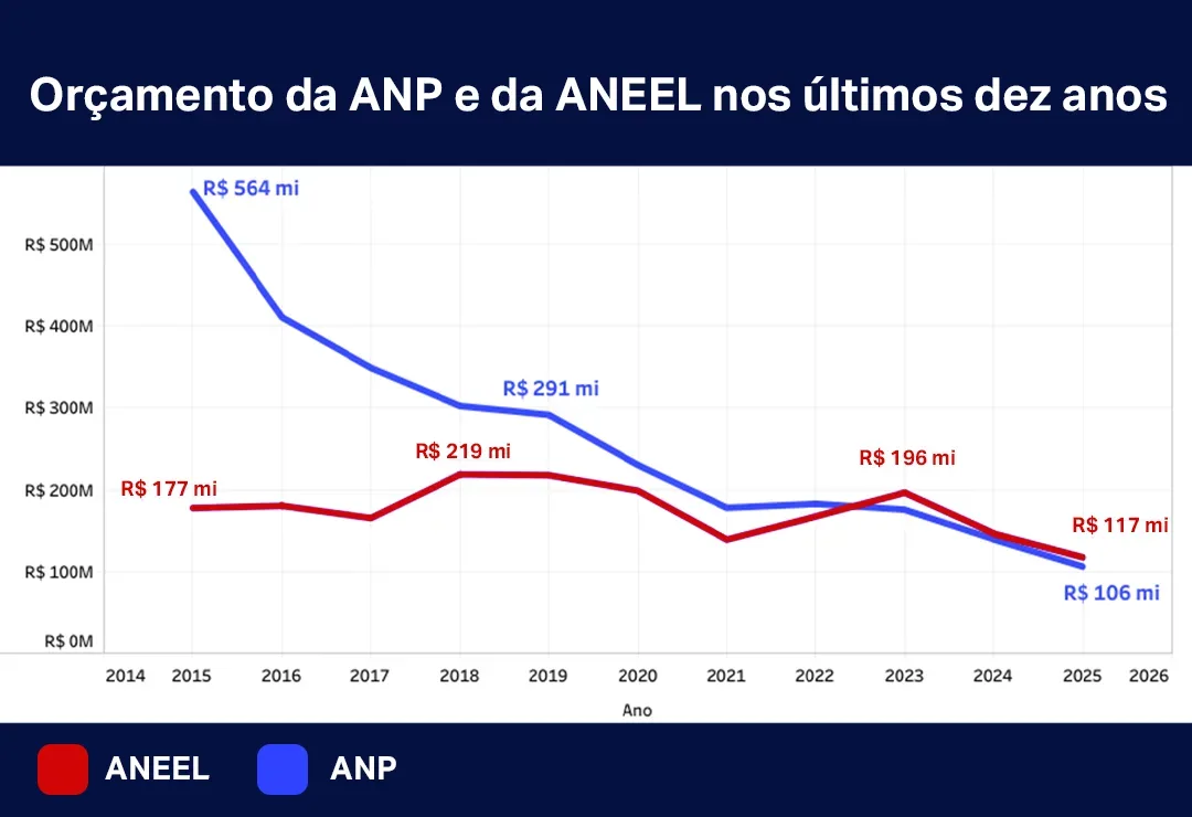 Se na ANEEL o quadro já é preocupante, na ANP (Agência Nacional do Petróleo, Gás Natural e Biocombustíveis) a situação é ainda mais severa: o orçamento despencou mais de 80% na última década, caindo de R$ 564 milhões em 2015 para R$ 106 milhões em 2025, com cortes sucessivos ano após ano.