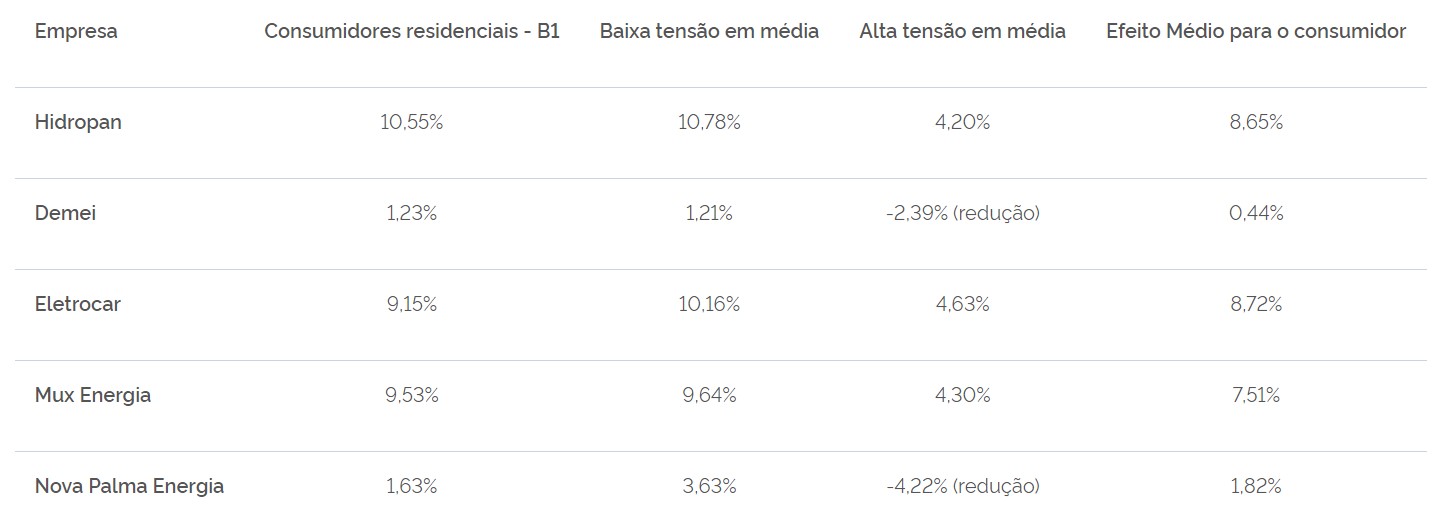 Segundo a ANEEL, o índice médio proposto na revisão tarifária da empresa foi impactado pelos custos com transmissão de energia e componentes financeiros estabelecidos no último processo tarifário, que se mantiveram em vigor até a atual revisão.