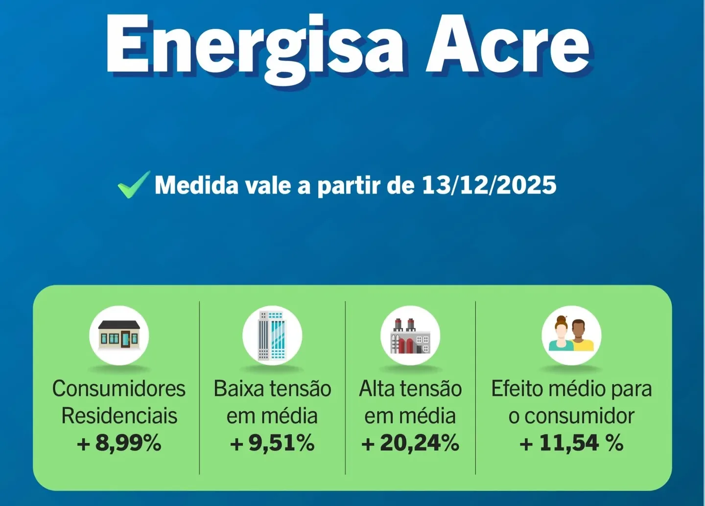 Para os consumidores do Acre, o efeito médio do reajuste será de 11,54%. As tarifas para clientes residenciais terão aumento de 8,99%, enquanto que para baixa tensão (categoria que inclui residências, pequenos comércios e estabelecimentos de menor porte ligados diretamente à rede de distribuição) o reajuste médio será de 9,51%.