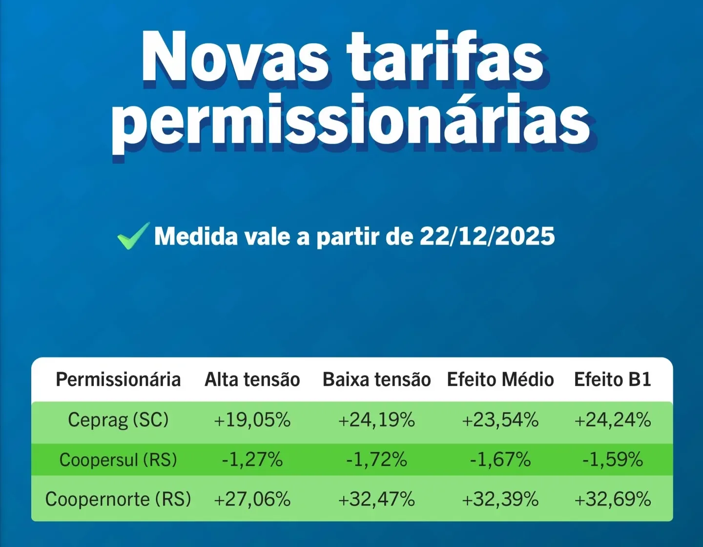 Os reajustes serão aplicados na Ceprag (Cooperativa de Eletricidade Praia Grande), na Coopersul (Cooperativa Regional de Eletrificação Rural Fronteira Sul Ltda) e na Coopernorte (Cooperativa Regional de Distribuição de Energia do Litoral Norte).