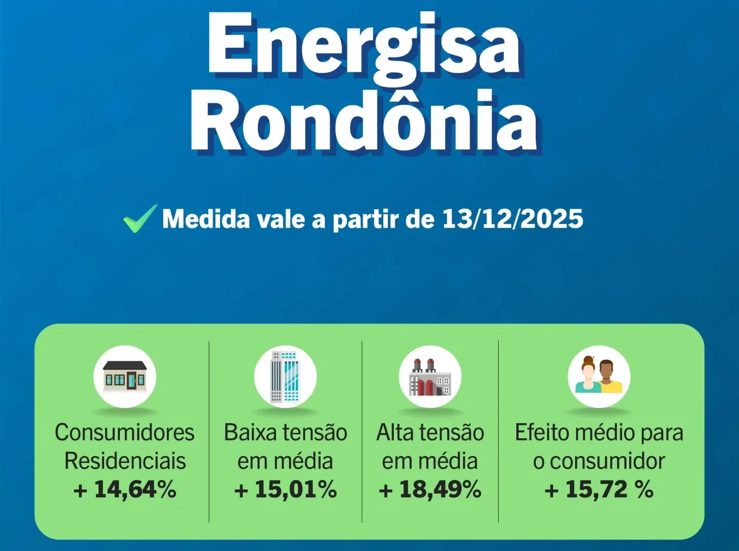 Em Rondônia, o impacto médio do reajuste na conta de luz será ainda maior, alcançando 15,72%. Para os consumidores residenciais, a alta será de 14,64%. Os clientes de baixa tensão terão aumento médio de 15,01%, enquanto os consumidores de alta tensão enfrentarão reajuste de 18,48%.