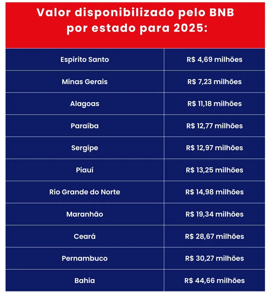 Confira abaixo os valores que foram disponibilizados pelo Banco do Nordeste para cada um dos 11 estado atendidos pela instituição financeira: