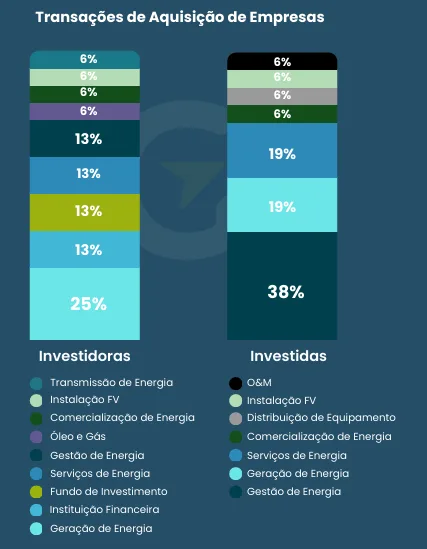 Das 16 aquisições de empresas da cadeia de valor do mercado solar, 25% dos investimentos vieram de empresas de geração de energia, 38% de empresas de gestão de energia e 69% dos investimentos são de empresas investidoras de capital nacional.
