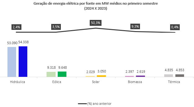 A primeira metade do ano foi marcada pela boa performance das energias renováveis. As hidrelétricas, que são a principal fonte do país, entregaram mais de 54 mil MW médios à rede, volume 2,4% superior ao registrado no mesmo período do ano passado. Eólicas, solares e usinas a biomassa, que produziram mais no comparativo anual, juntas geraram mais de 15 mil MW médios.