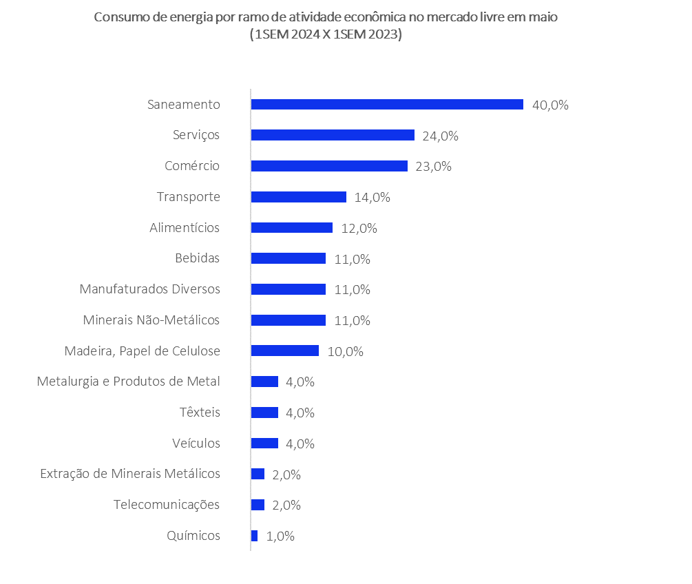 Todos os 15 setores monitorados pela Câmara de Comercialização registraram aumento no consumo de energia nos seis primeiros meses deste ano. Os destaques foram os ramos de Saneamento (40%), Serviços (24%) e Comércio (23%), sendo que os dois últimos foram influenciados pela variação da temperatura.