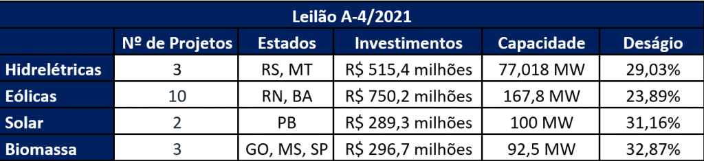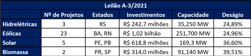Os acordos firmados somaram mais de R$ 4 bilhões em investimentos nas obras das usinas, que terão duração de 20 e 30 anos e início de suprimento em janeiro de 2024 e janeiro de 2025. Ao todo, 33 empresas se consagraram vencedoras do leilão A-3, por oferecerem o menor preço de venda de sua energia. Os projetos somam R$ 2,2 bilhões em investimentos e o deságio médio foi de 30,83%.