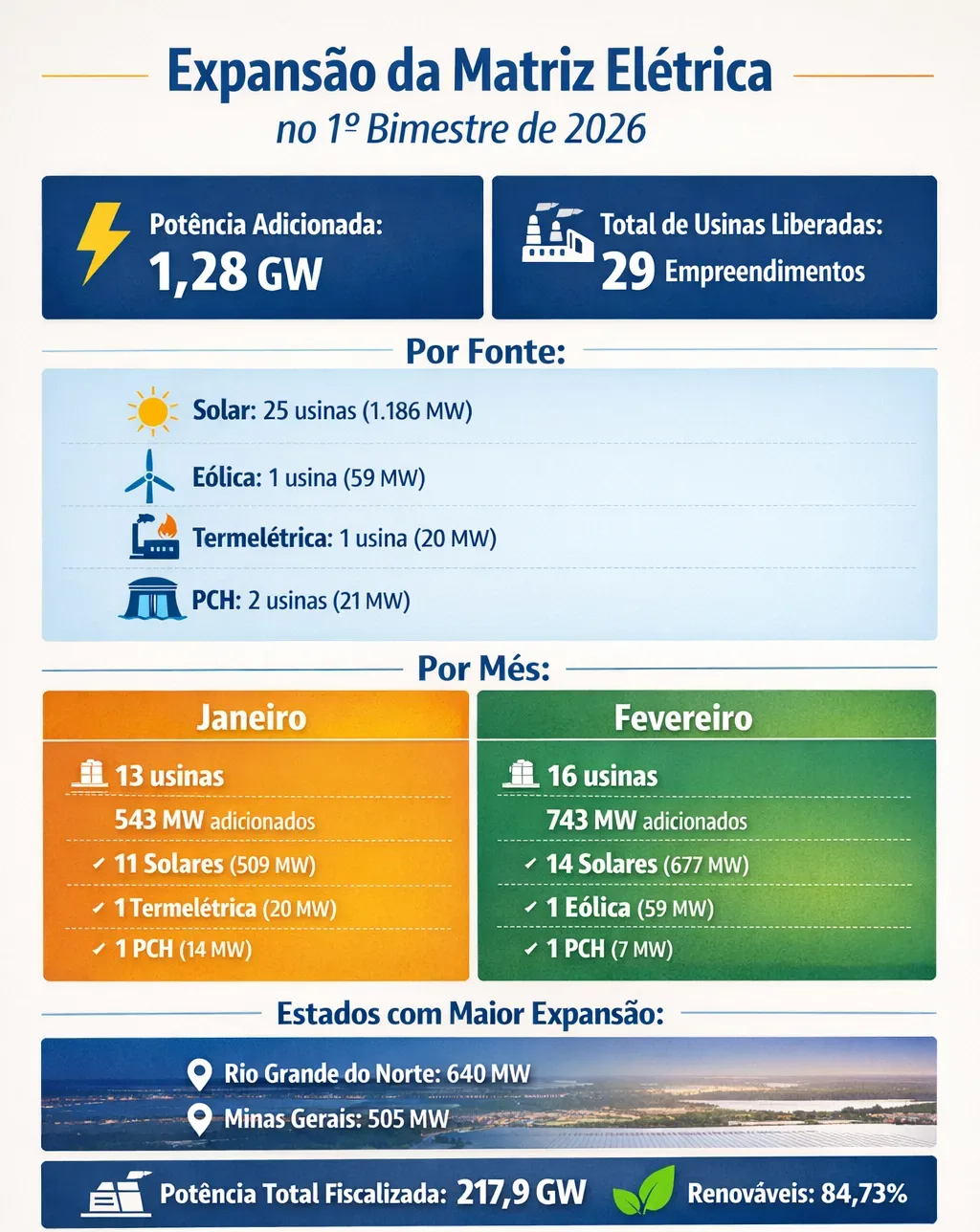 O Brasil registrou um crescimento de 1,28 GW em sua matriz elétrica no primeiro bimestre de 2026, segundo dados divulgados pela ANEEL (Agência Nacional de Energia Elétrica). No acumulado do período, foram liberadas 29 usinas para operação comercial no país, das quais 25 são solares, uma termelétrica, uma eólica e duas PCHs (Pequenas Centrais Hidrelétricas).