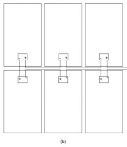 O polo positivo de um módulo é ligado ao negativo do outro e assim sucessivamente. Os módulos da fileira de cima são conectados aos da fileira de baixo e assim por diante, até chegar ao final da string (conjunto de módulos em série). Nas duas pontas sobram dois terminais (sendo um positivo e um negativo), conforme vemos na figura abaixo.