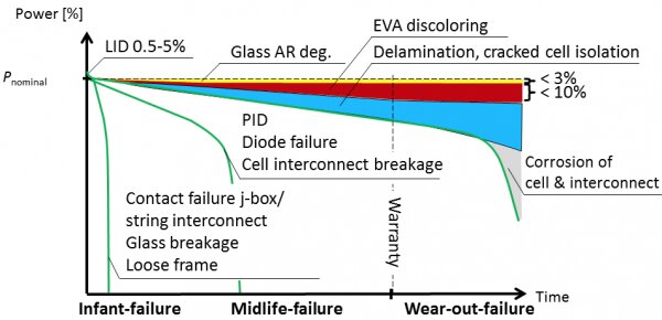 O gráfico abaixo mostra a influência de diversos fenômenos na degradação da potência dos módulos fotovoltaicos. A delaminação (região azul do gráfico) está entre as maiores causas de redução da potência ao longo da vida útil dos módulos.