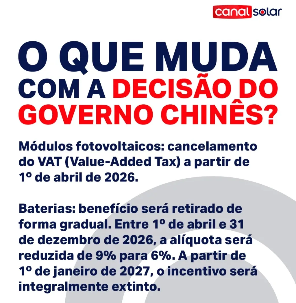 Com a nova diretriz, o incentivo será totalmente extinto para os módulos fotovoltaicos a partir de 1º de abril de 2026. Para as baterias, o governo chinês adotará uma transição gradual: o subsidio será reduzido de 9% para 6% entre abril e dezembro de 2026, e depois totalmente cancelado a partir de 1º de janeiro de 2027.