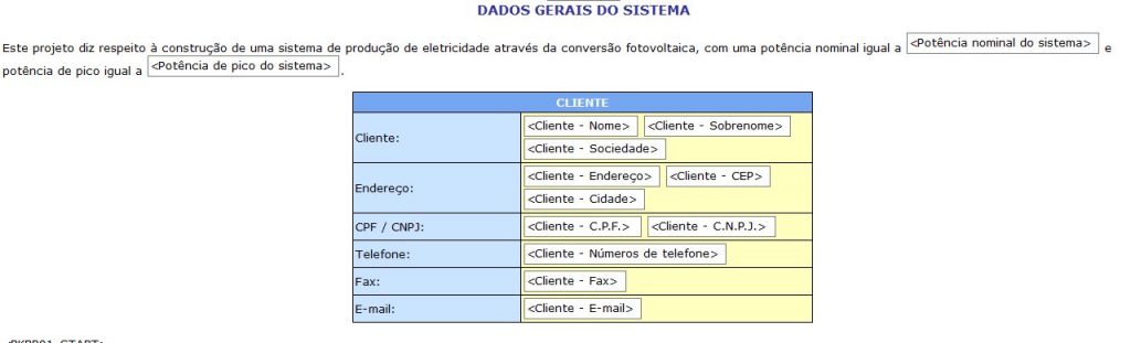 As etiquetas são os valores entre os símbolos “<” e “>”. O campo descrito nas etiquetas será referenciado aos valores que o programa encontrou para aquele campo. Então, por exemplo, a etiqueta “<Potência nominal do sistema>” será preenchida pela potência do sistema na hora da exportação do documento.