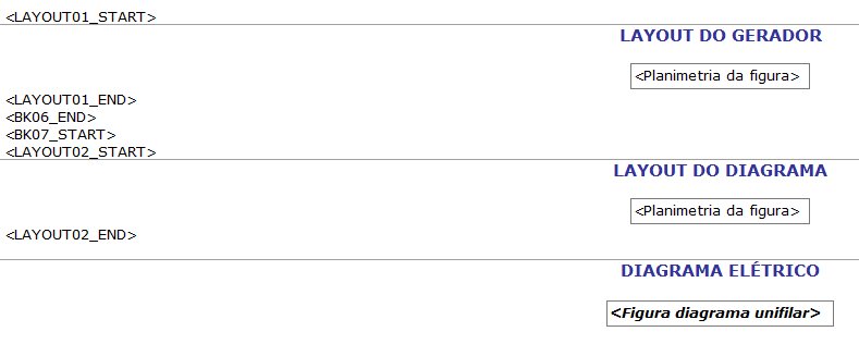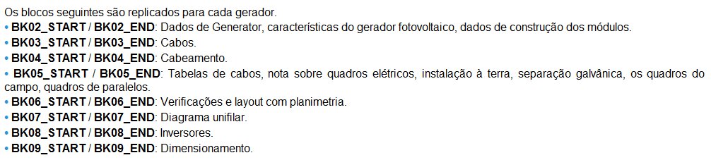 Além das etiquetas que foram inseridas é necessário que sejam atribuídos os códigos de páginas. Estes códigos servem para separar as seções de informações contidas no documento, por exemplo, os dados pessoais do cliente e técnico responsável são incluídas na seção “BK00_START e END”, já os dados técnicos do gerador fotovoltaico são incluídas na seção “BK02_START e END”.