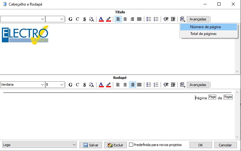 O software também permite incluir cabeçalho e rodapé, acessando o campo Arquivo – Cabeçalho e rodapé. Será aberta uma janela que permite inserir imagens, textos e etiquetas de numeração de páginas que vão ser adicionadas no cabeçalho e no rodapé de cada página do relatório, conforme a representação abaixo.
