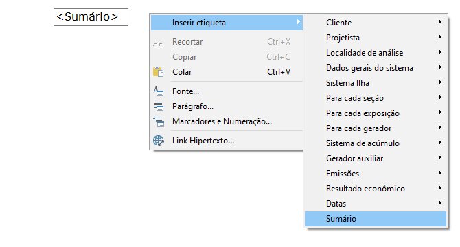 Uma outra função que pode ser incluída nos documentos personalizados do software é o sumário. Para poder inseri-lo basta selecionar um campo e clicar com o botão direito do mouse e selecionar a etiqueta “Sumário”, conforme a representação abaixo.