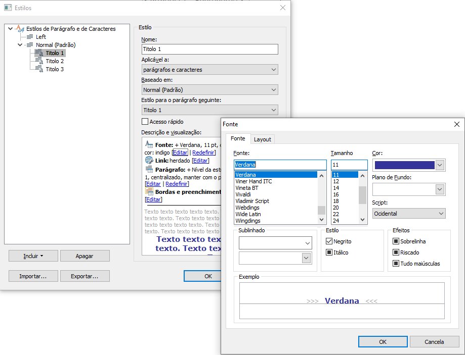 Cada “Título” representa um nível, ou seja, o Título 1 é o primeiro nível e o Título 2 representa o segundo nível ou subtítulo. Para poder formatar os “Títulos” acesse o campo Formatar – Estilos. Nessa janela é possível alterar as fontes, tamanhos, e níveis, entre outras opções, e mantê-las predefinidas para os próximos documentos, conforme a representação abaixo.