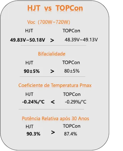 Os módulos HJT apresentam melhor desempenho sob condições reais de operação, pois seu coeficiente de temperatura de Pmax é menor do que o dos módulos TOPCon, sendo de apenas -0,24%/ºC.