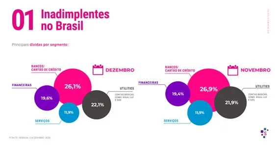 A conta de luz está entre os principais fatores de inadimplência no Brasil. Dados da Serasa mostram que as dívidas classificadas como utilities, que englobam principalmente tarifa de energia e água, fecharam 2025 representando 22,1% do total da inadimplência no país, ficando atrás apenas de bancos e cartões de crédito (26,1%).