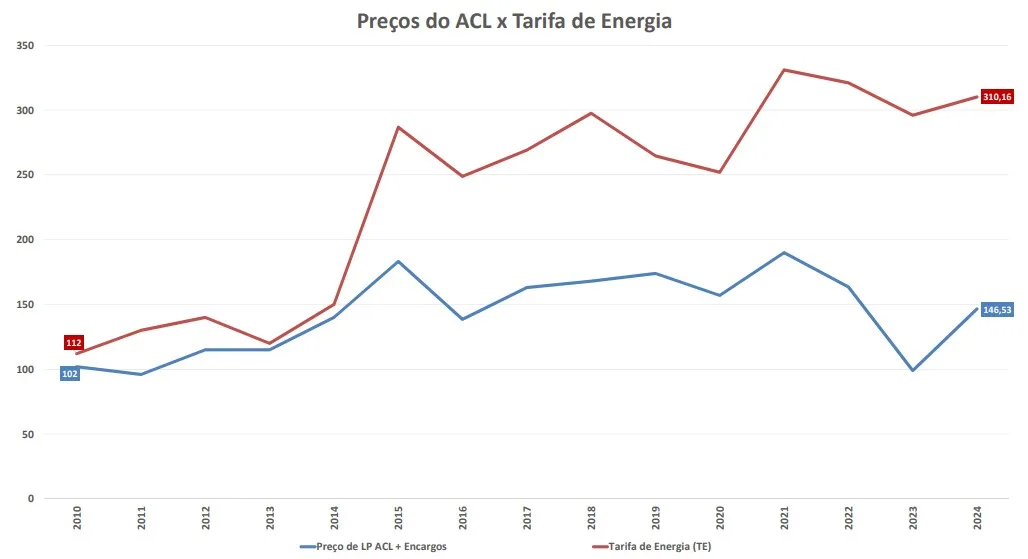 Os dados revelam ainda uma disparidade crescente entre o custo da energia para consumidores cativos (residências e pequenos negócios) e para os grandes consumidores do ACL (Ambiente de Contratação Livre).