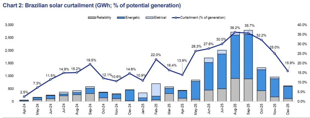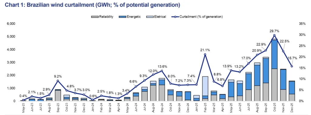 O curtailment — os cortes na geração de energia — permaneceu elevado no 4º trimestre de 2025, embora tenha apresentado uma queda consistente no encerramento do ano, segundo análise do BTG Pactual.