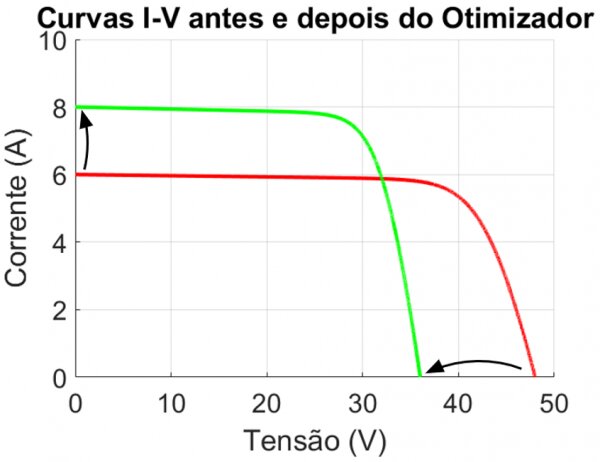 Os otimizadores redimensionam a curva I-V desses módulos, aumentando sua corrente e diminuindo a tensão. Essa mudança é feita na saída do otimizador. O que será enxergado pelo inversor de string é a curva modificada, na qual o módulo será compatível com o restante da string. Em resumo, um módulo que em determinada condição climática (irradiância e temperatura) apresenta uma curva I-V com Isc = 6 A e Voc=48 V, em série com outros módulos de corrente superior (8 A), vai apresentar uma curva I-V redimensionada.