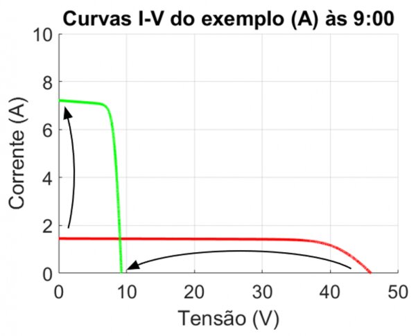 Como as curvas I-V sofrem influência da irradiância e da temperatura, elas irão variar durante todo o dia. Para conseguir analisar vamos escolher dois momentos do dia: 9:00h e meio-dia (12:00h). A simulação foi feita utilizando módulos de 400 Wp, na cidade de São Paulo e no mês de janeiro. Para o nosso exemplo (A), onde temos uma string de 10 módulos, estando 3 sombreados, temos: