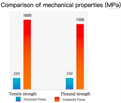 - A resistência à tração da estrutura de material compósito é 6 vezes maior que a da estrutura tradicional de alumínio, atingindo 1600 MPa; a resistência à flexão é 5 vezes maior que a da estrutura tradicional de alumínio, atingindo 1500 MPa;
