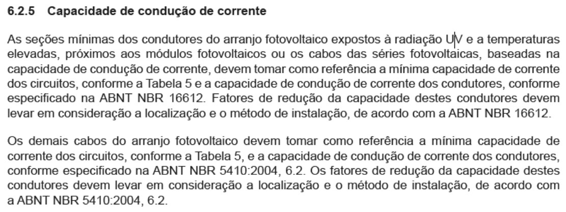 A NBR 16690, norma que regula os sistemas fotovoltaicos, indica que todos os condutores de sistemas fotovoltaicos devem ser dimensionados seguindo os preceitos das normas NBR 5410 e NBR 16612 (cabos específicos para aplicações solares).