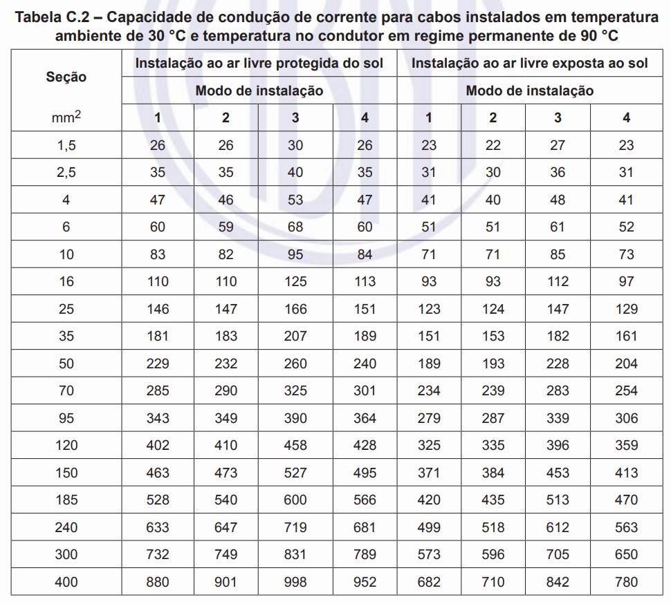Da tabela de capacidade de condução de corrente, obtemos então que a seção mínima do condutor deve ser de 50 mm².