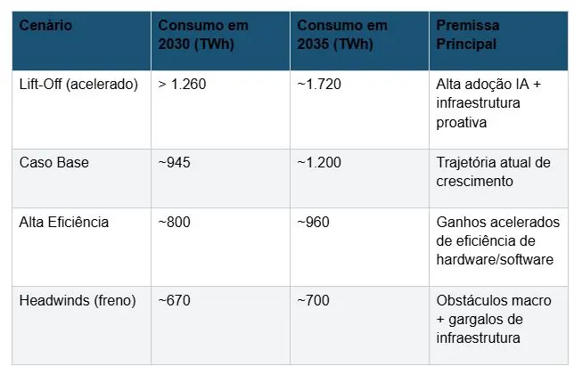 O espectro de incerteza é expressivo: em 2035, o range vai de 700 a 1.720 TWh dependendo do ritmo de adoção da IA e dos avanços em eficiência.