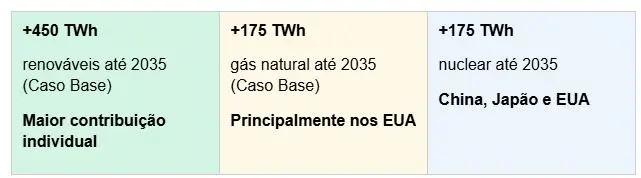 A IEA indica que nenhuma fonte única dará conta sozinha. A combinação vencedora envolve renováveis liderando, gás natural como suporte despachável, e nuclear entrando progressivamente — incluindo os primeiros Pequenos Reatores Modulares (SMRs) a partir de 2030.