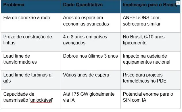 O relatório da IEA identifica as redes de transmissão e distribuição como o principal ponto de estrangulamento do ciclo. Estima-se que, sem ações corretivas, cerca de 20% dos projetos de data centers planejados globalmente estarão em risco de atraso por falta de conexão à rede.