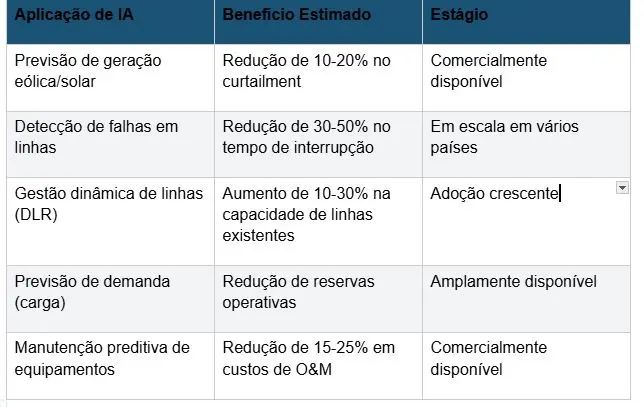 A IEA mapeia diversas aplicações de alto impacto já em uso por operadores de sistemas ao redor do mundo. A previsão de geração de fontes variáveis com IA reduz o curtailment e otimiza o despacho. Algoritmos de aprendizado de máquina aplicados a dados de PMUs (Phasor Measurement Units) melhoram a estabilidade em tempo real.