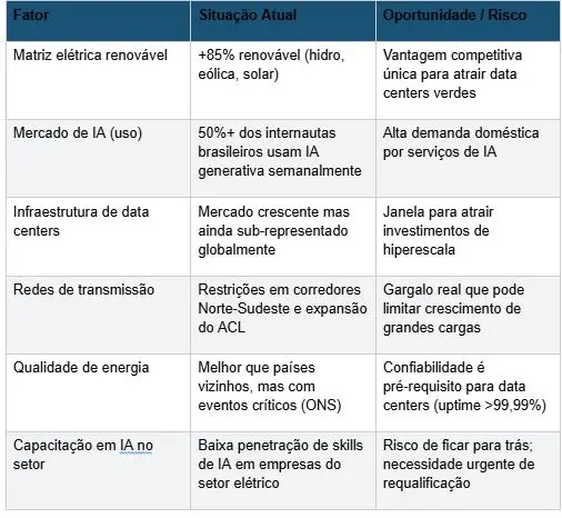 Para o Brasil, a equação tem componentes favoráveis raramente encontrados em outros mercados: matriz predominantemente renovável, mercado consumidor de IA já expressivo, e localização geográfica estratégica.