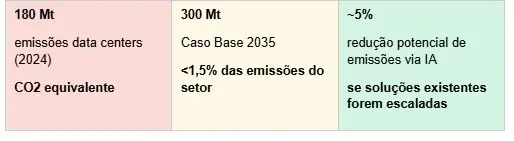Por outro lado, a adoção ampla de aplicações de IA para otimização energética poderia gerar reduções de emissões equivalentes a cerca de 5% das emissões energéticas globais em 2035.