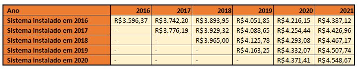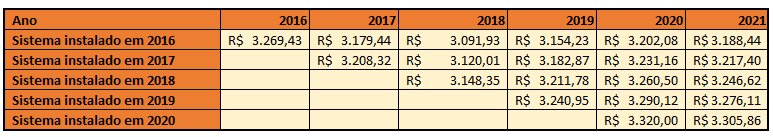Para prever então o impacto de postergar os investimentos de 2020 em diante, assumiremos que no Brasil essa tendência de queda anual de 4,2% nos custos dos sistemas vai se aplicar, conforme mostra a tabela abaixo.
