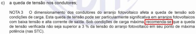 A norma recomenda, mas não exige, que a queda de tensão no circuito CC não seja superior a 3%. Sempre que possível, a orientação da norma deve ser seguida. Em caso de não atendimento da orientação, o projetista deve apelar a sua experiência e a outros fatores técnicos para tomar a melhor decisão.