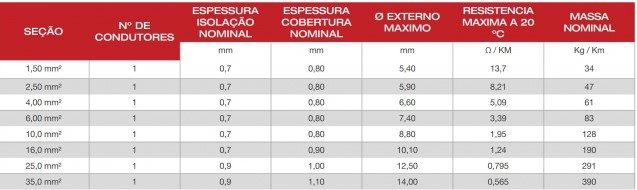 A seguir encontramos a tabela com as características dos cabos empregados no projeto (Cortox Solar/Cordeiro Cabos Elétricos).