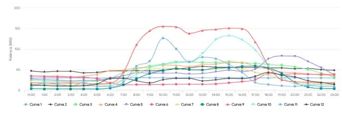 - Agroindústria com operação contínua/carga de base (curva 2): perfil bastante plano, típico de processos com baixa flexibilidade operacional (ex.: frigoríficos, resfriamento de leite em grande escala e silos automatizados). Em geral, é um grupo com menor capacidade de modulação.