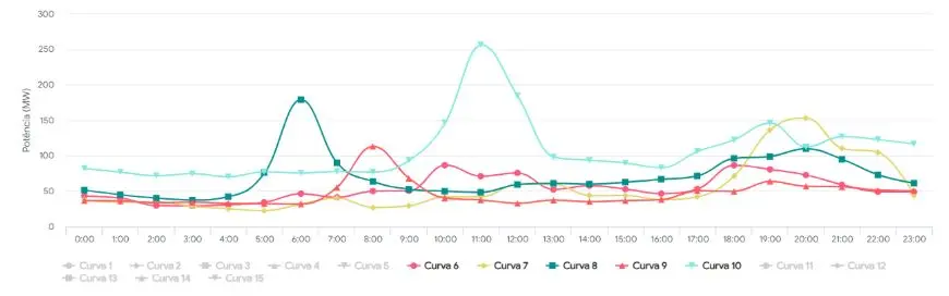 - “Vilão” da ponta (curva 10): exibe um pico expressivo por volta das 18h, característico do consumo residencial rural (agrovilas e sedes de fazendas), possivelmente associado a cargas acionadas no início da noite (iluminação de granjas, aquecimento e bombas). Esse grupo tenderia a ser fortemente penalizado por uma tarifa horária com ponta elevada (por exemplo, entre 18h e 21h).