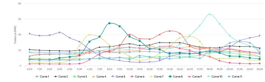Nos gráficos, observa-se uma elevada heterogeneidade de perfis: há desde curvas com demanda praticamente constante ao longo das 24 horas até aquelas com picos de potência bem acentuados, distribuídos em diferentes janelas horárias. Embora a maioria concentre o maior consumo no período noturno (entre 18h e 22h), também se identificam comportamentos singulares, com picos isolados na madrugada, manhã ou tarde, evidenciando a diversidade na forma de utilização da rede elétrica ao longo do dia.