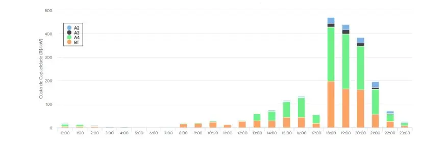 Observe como a curva de custo marginal de capacidade calculado em função dos carregamentos para atendimento dos consumidores em baixa tensão, no caso da Cemig, é quase plana durante a maior parte do dia e sofre uma elevação abrupta a partir das 18h, mantendo-se bastante elevada até as 21h.