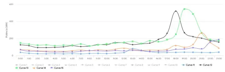 As três figuras anteriores apresentam 15 curvas de carga em baixa tensão utilizadas no cálculo da estrutura tarifária da Cemig no processo de revisão tarifária de 2023 para a classe residencial, ajustadas à energia faturada.