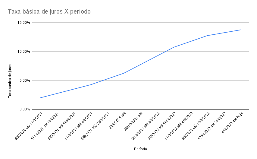 Dados do Copom mostram que o valor da Selic aumentou de 2% ao ano, de março de 2021 para os atuais 13,75% – o maior índice desde novembro de 2016, quando a taxa básica de juros cobrada era de 14% ao ano, conforme ilustra a imagem abaixo: