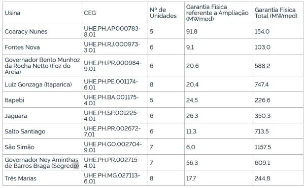 Confira a lista completa com a garantia física de cada usina participante.