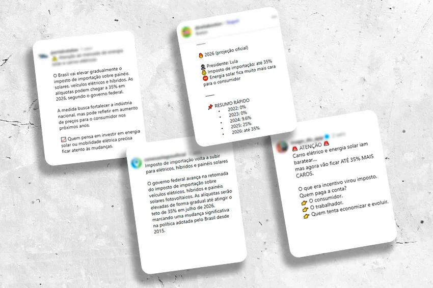 A interpretação equivocada pode estar associada a uma confusão entre políticas tributárias aplicadas a produtos distintos, especialmente à comparação entre o setor fotovoltaico e o de veículos elétricos, já que muitas postagens equivocadas misturam os dois temas, conforme mostra a imagem abaixo.