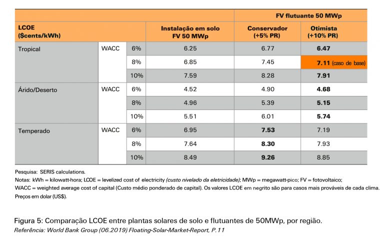 O aumento esperado de rendimento ou do PR (performance ratio) está entre 5% a 10% em comparação com sistemas solares montados em solo. A tabela a seguir, elaborada pelo SERIS (Solar Energy Research Institute of Singapore) mostra a comparação do LCOE entre a mesma usina solar (50 MWp) montada em solo e flutuante em três locais ou regiões diferentes.