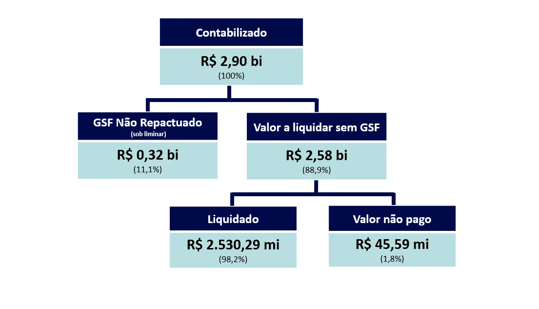 No mês, os agentes que possuem decisões judiciais vigentes para não participarem do rateio da inadimplência advinda das liminares do GSF registraram adimplência próxima de 98%.