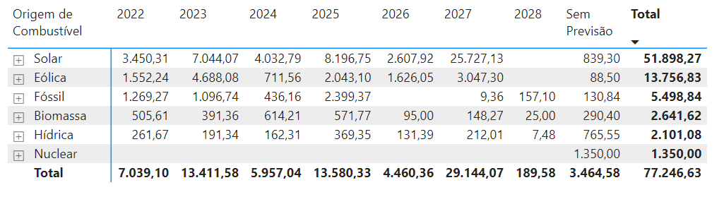 Este montante deve incrementar cerca de 51.058,97 MW até 2027 (este montante não integra as usinas que não possuem previsão de liberação de operação comercial). Veja o gráfico abaixo.