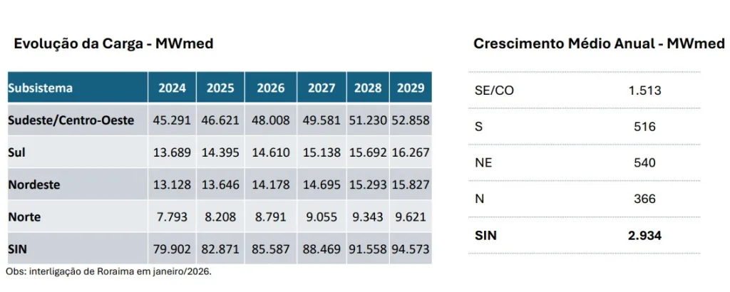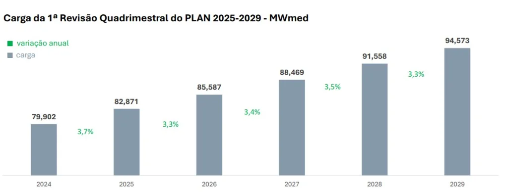 Para 2025, o crescimento projetado é de 3,7% na carga global, atingindo o valor de 82.871 MWmed. Em 2029, está previsto o valor de 94.573 MWmed. Os dados consideram a MMGD (Micro e Minigeração Distribuída) e a integração de Roraima no SIN em janeiro de 2026.